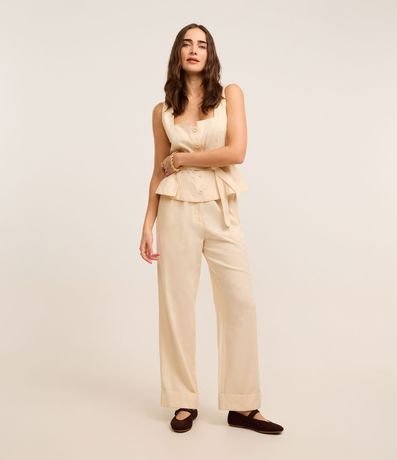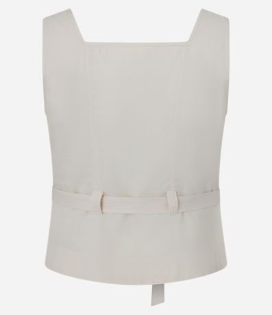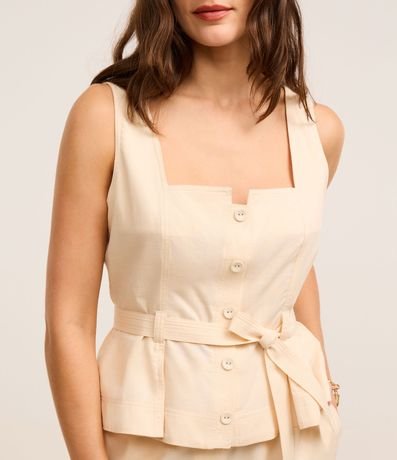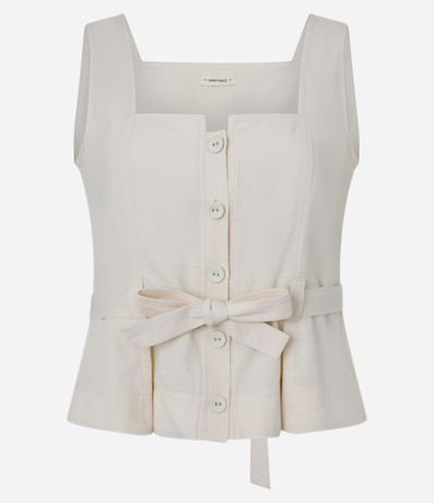 Ref: Blusa sem mangas, confeccionada em sarja com algodão mais sustentável, com decote quadrado com amarração e passantes na cintura. Dispõe de abotoamento frontal.