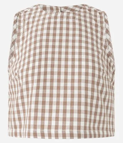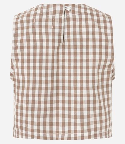 Blusa sem mangas, confeccionada em sarja, com gola redonda com fechamento por gota e estampa xadrez bichy. Este produto possui algodão certificado BCI em sua composição, além de ter sido produzido através de processos mais sustentáveis, sendo ambientalmente mais responsável.