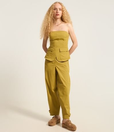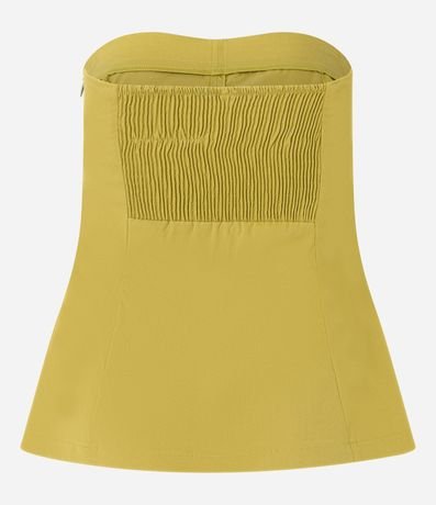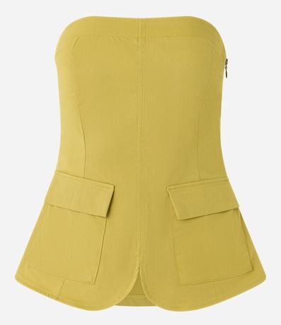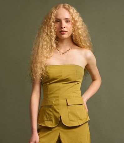 Ref: Blusa tomara que caia confeccionada em sarja, produzida através de boas práticas ambientais, fechamento por zíper invisível na lateral e bolsinhos com lapela na parte da frente. Possui lastex nas costas e barra arredondada.
