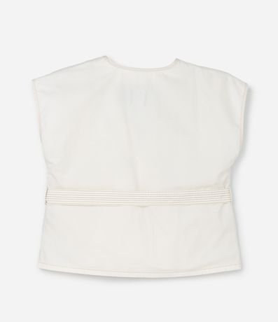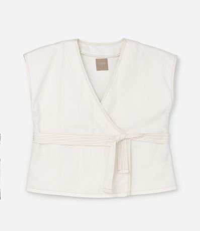 Blusa feminina confeccionada em sarja, de algodão regenerativo mais sustentável. Possui decote em V, sem mangas e com faixa para amarração na cintura. Possui detalhes de pespontos contrastantes.