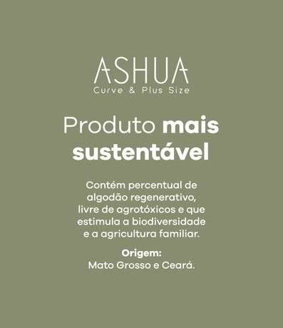 Produto contém percentual de algodão responsável. O algodão dos nossos produtos é adquirido como algodão mais sustentável. Chamamos de algodão mais sustentável o algodão que é cultivado de forma mais responsável, de maneira que cuide do solo e da água e que proporcione condições de trabalho seguras aos agricultores. Consideramos como algodão mais sustentável, materiais adquiridos como Algodão Brasileiro Responsável (ABR); Orgânico; Agroecológico, Reciclado ou Better Cotton.