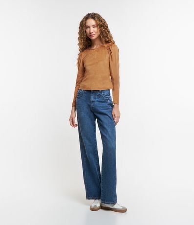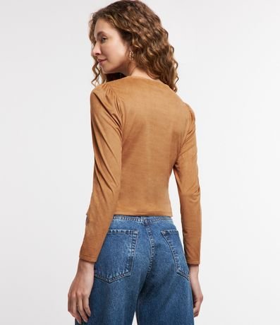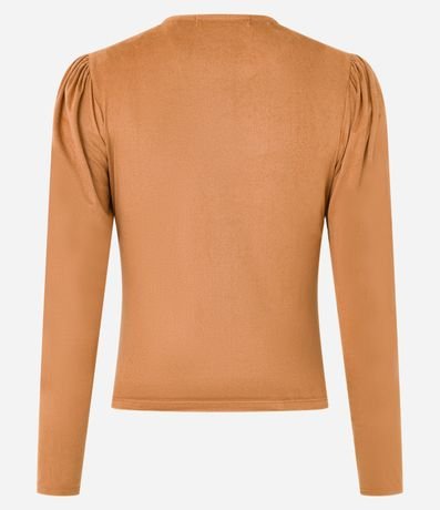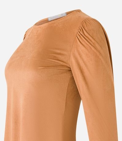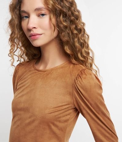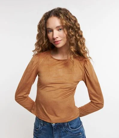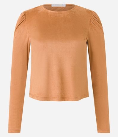 Blusa feminina confeccionada em suede, com gola redonda e mangas longas. Sem estampa, possui detalhe de franzidos nos ombros.