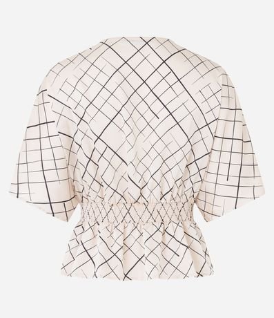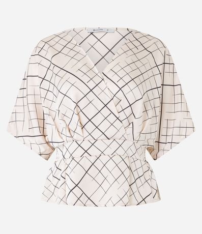 Blusa feminina, confeccionada em tecido acetinado, com decote V transpassado, mangas curtas, cintura elástica e estampa linhas cruzadas.