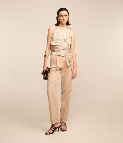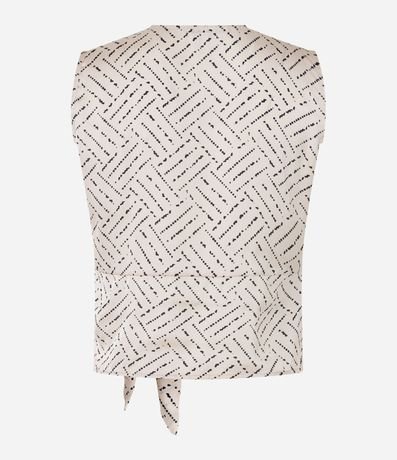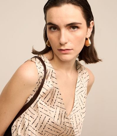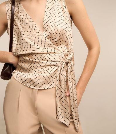 Ref: Blusa sem estampa feminina, confeccionada em tecido acetinado, com transpasse frontal, amarração lateral e estampa abstrata.