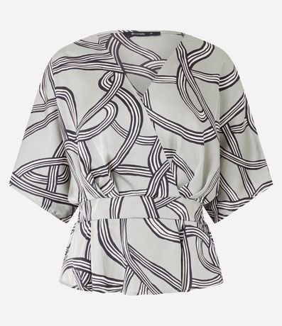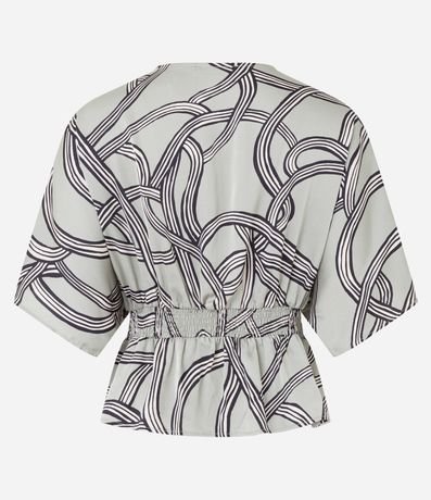 Ref: Blusa feminina, confeccionada em tecido acetinado, com decote V transpassado e cintura elástica. A peça também conta com estampa abstrata.