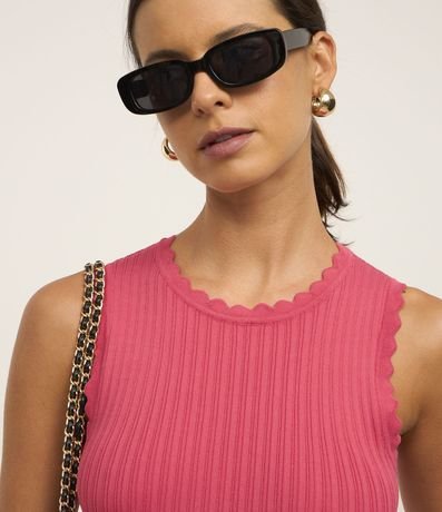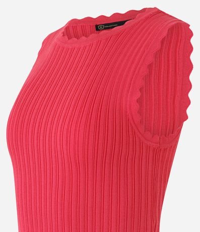 Ref: Blusa sem mangas em tricô leve com gola redonda e textura canelada. Possui detalhes com barras nuvens.