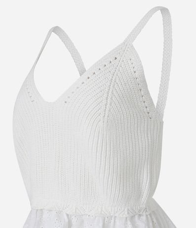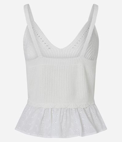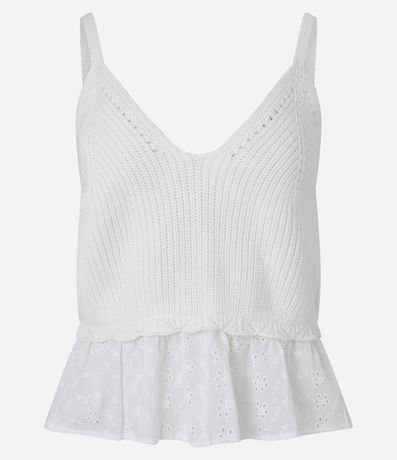 Ref: Blusa feminina em tricô com decote em v, detalhe de furinhos, alças médias e babados na barra.