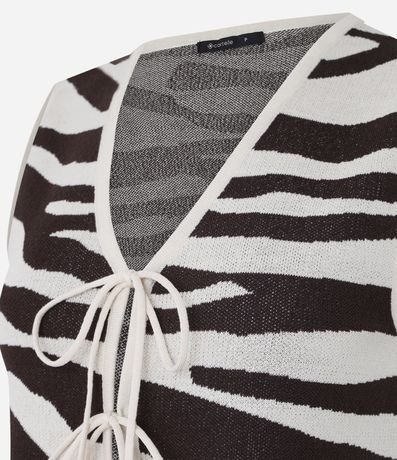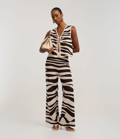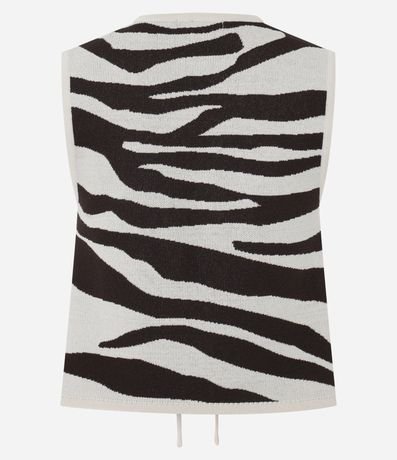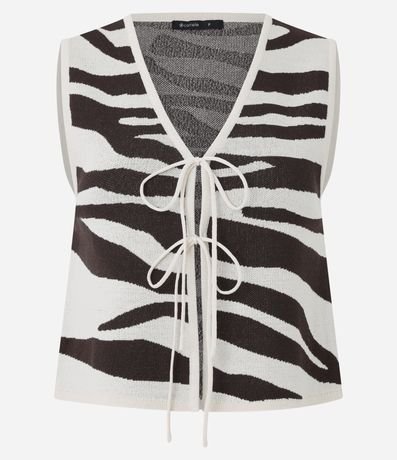 Blusa sem mangas, confeccionada em tricô, com decote, amarrações frontais e estampa animal print de zebra. Este produto possui material mais sustentável em sua composição, sendo ambientalmente mais responsável.