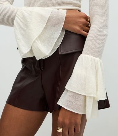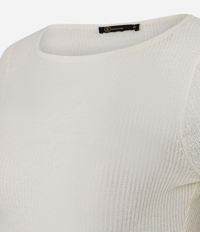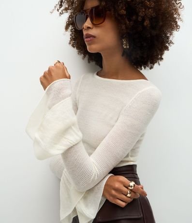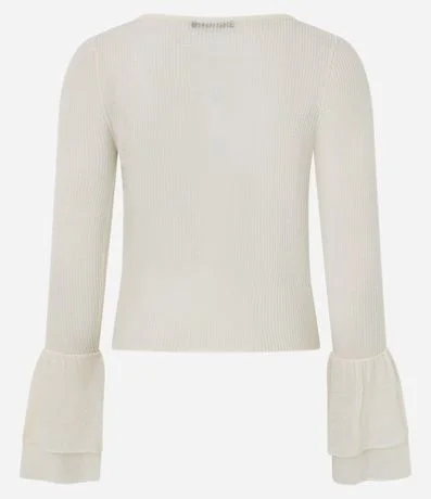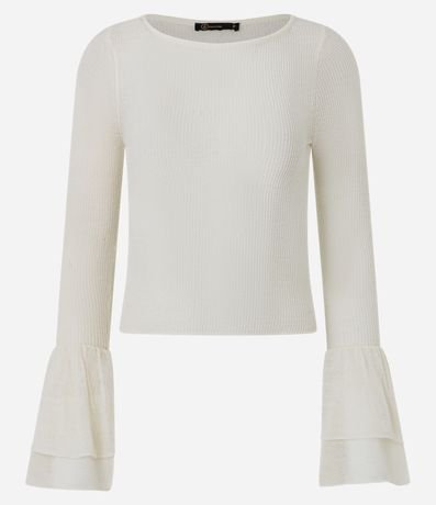Ref: Blusa feminina de tricô com manga longa e gola canoa. As mangas possuem babados amplos na barra, criando volume. O tricô é leve e estruturado, com acabamento reto na barra.