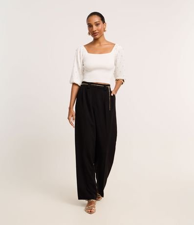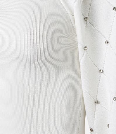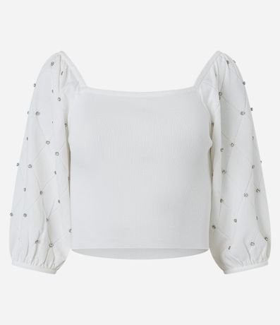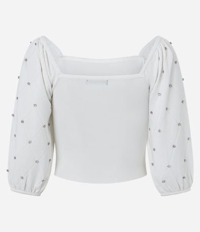 Blusa de mangas bufantes curtas, confeccionada em viscose, com decote quadrado. Peça tem textura de losango e pedrarias de strass nas mangas. Este produto possui viscose certificada em sua composição, sendo ambientalmente mais responsável.