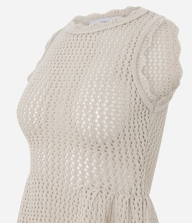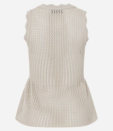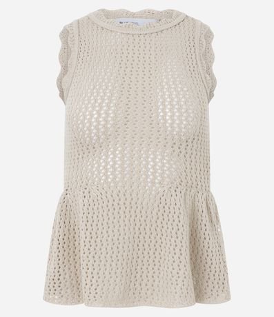 Blusa feminina cavada confeccionado em tricô com efeito vazado, trazendo leveza e sofisticação ao visual. Possui modelagem evasê e acabamento com bordas onduladas, garantindo um toque delicado.