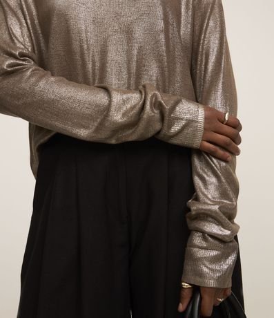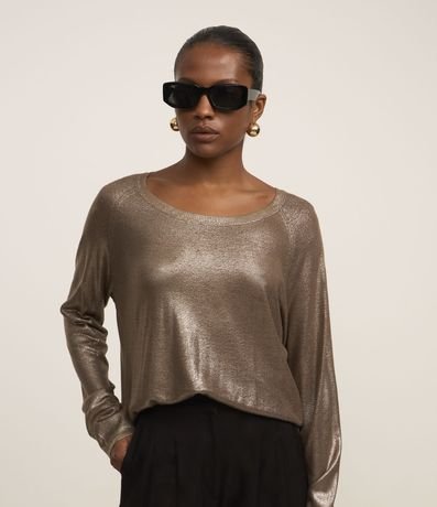 Ref: Blusa confeccionada em tricô leve de acrílico e viscose mais sustentável com cavas raglan, decote redondo e mangas longas. Conta com malha com foil metalizado.
