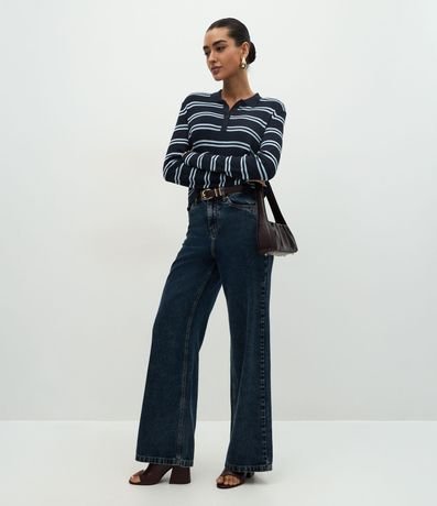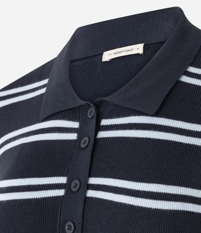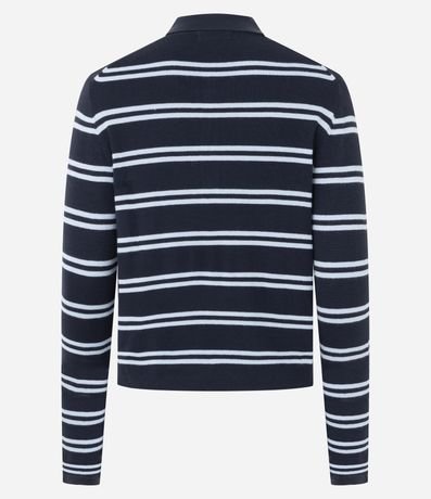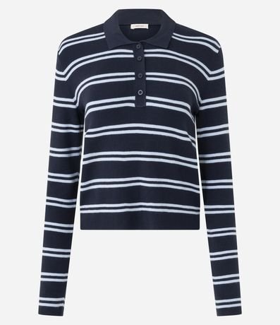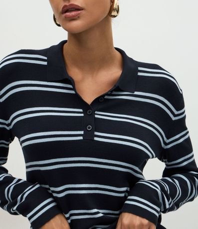 Ref: Blusa feminina em tricô confeccionado com viscose mais sustentável. Possui estampa com listras horizontais, modelagem reta, gola polo com três botões frontais, mangas longas e punhos canelados.