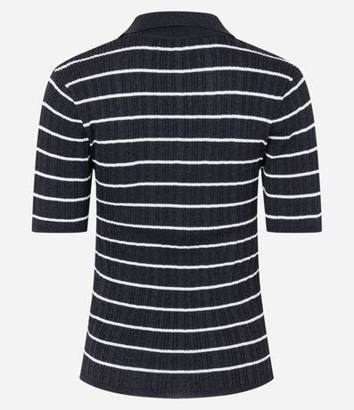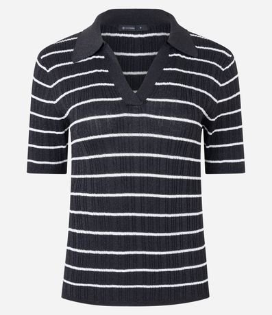 Blusa feminina, confeccionada em tricô leve, com decote V, lapela, estampa listrada e detalhe em fio metalizado.
