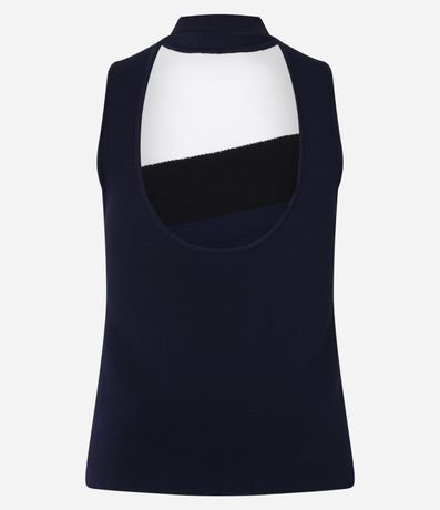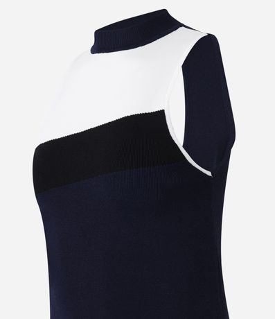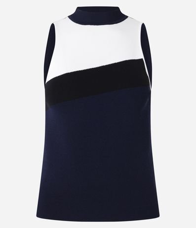 Ref: Blusa feminina confeccionada em tricô, com gola redonda, sem mangas e com detalhe tricolor.