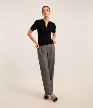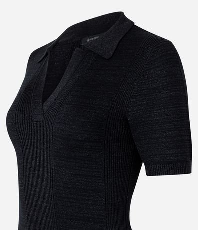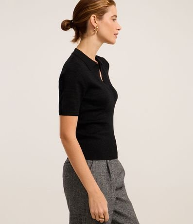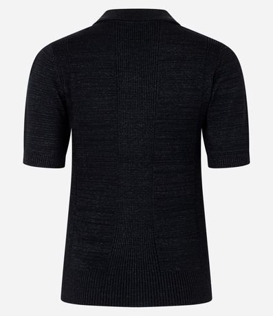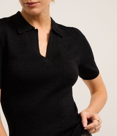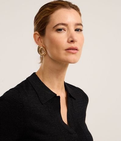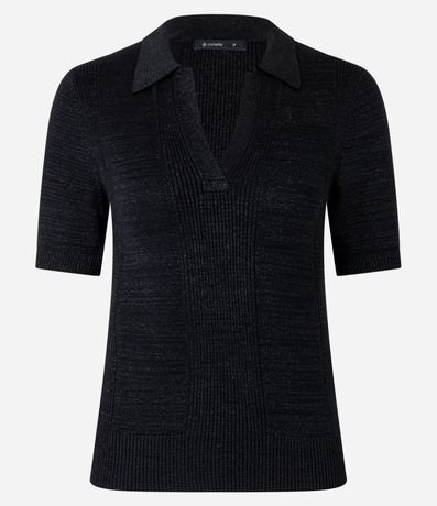 Ref: Blusa de mangas curtas em tricô leve com gola polo com detalhe V além de fios metalizados.