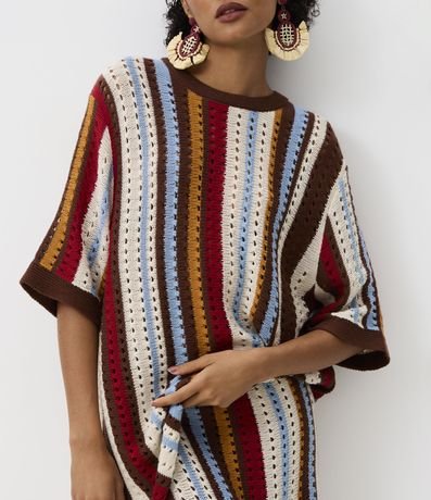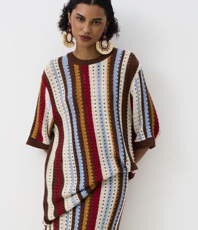 Blusa de mangas curtas, confeccionado em tricô, com listras verticais em cores e espessuras variadas. Peça com pontos abertos em efeito de crochê. Esta peça faz parte da collab Ateliê Mão de Mãe.