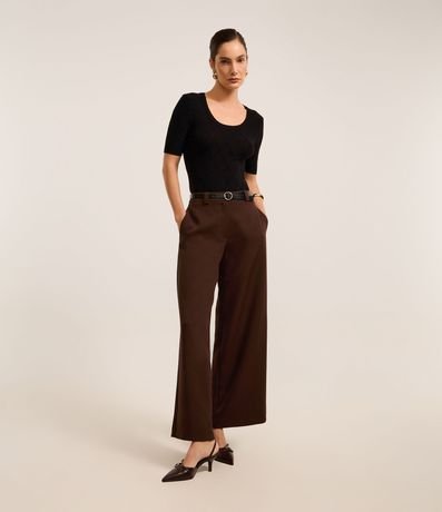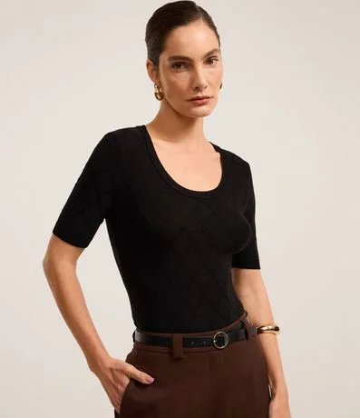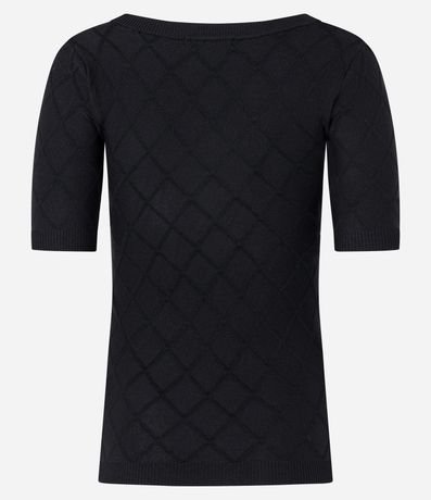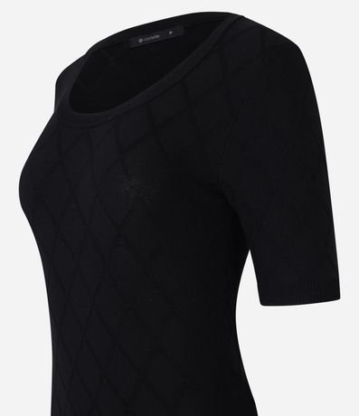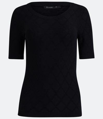 Blusa em tricô com decote redondo, manga curta e losangos em textura.