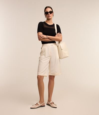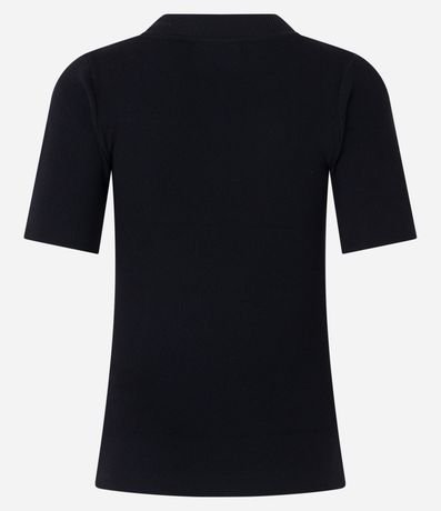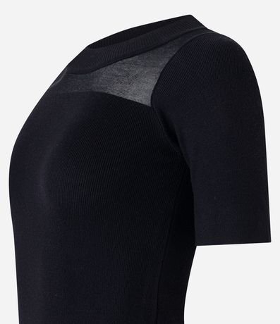 Ref: Blusa feminina confeccionada em tricô, com gola redonda e mangas curtas. Sem estampa, possui diferencial de textura canelada e recorte em tule.