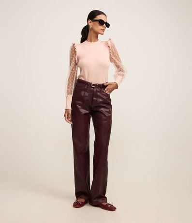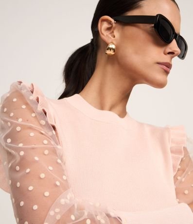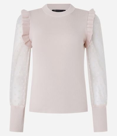 Ref: Blusa de mangas longas de chiffon, confeccionada em tricô leve com viscose mais sustentável. Blusa tem gola redonda, babados nas cavas e mangas transparentes com poás.