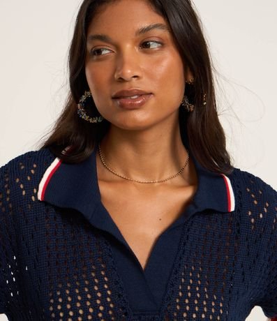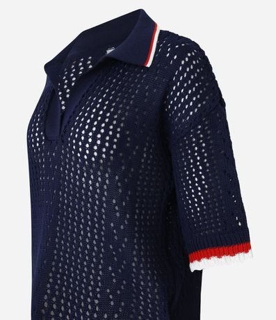 Blusa com gola polo, confeccionada em tricô com ponto baerto, listras contrastantes na barra e mangas, cava deslocada e produzida atraves de boas práticas ambientais.
