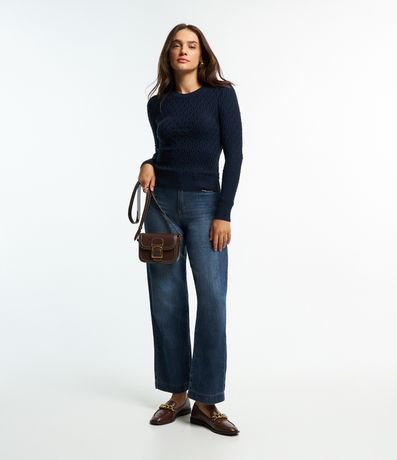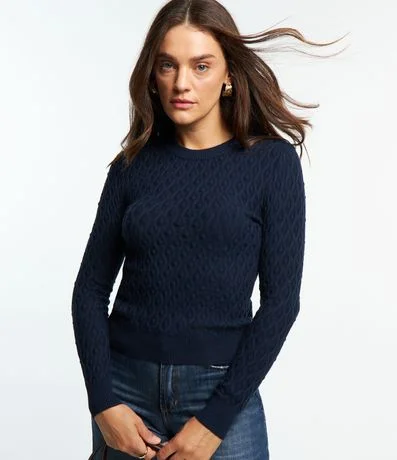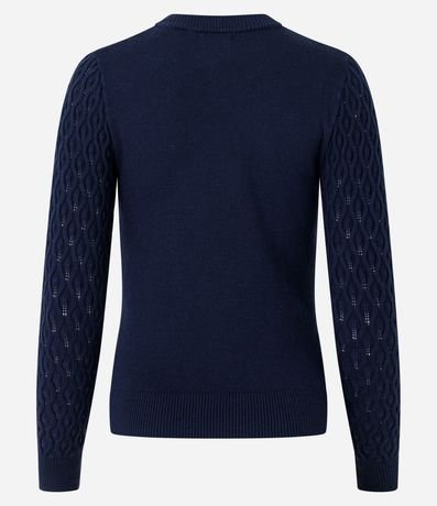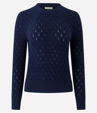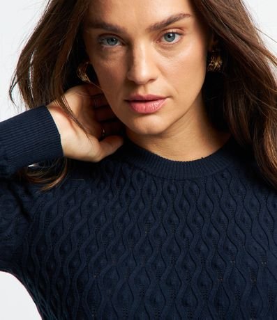Ref: Blusa feminina confeccionada em tricô leve, com gola redonda e mangas longas. Sem estampa, possui textura de ondinhas e terminações caneladas.