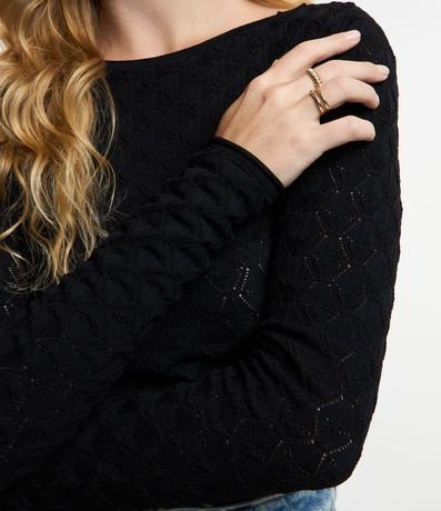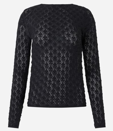 Blusa feminina, confeccionada em tricô, com gola redonda, mangas longas e textura padronagem geométrica.