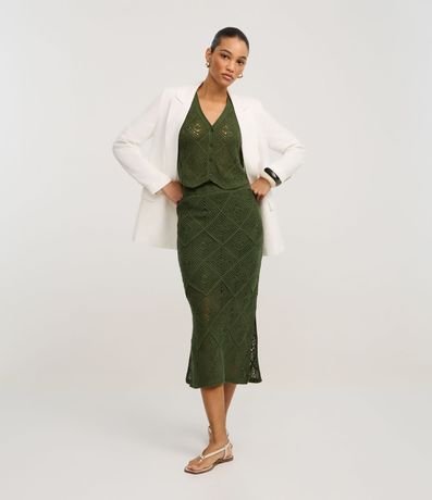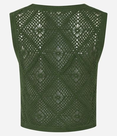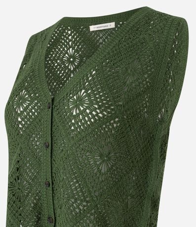 Ref: Blusa sem mangas, confeccionada em tricô, com decote V, botões frontais e pontos de efeito crochê. Este produto possui algodão certificado em sua composição, sendo ambientalmente mais responsável.