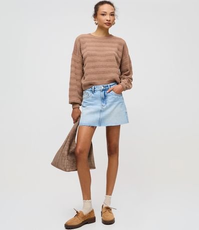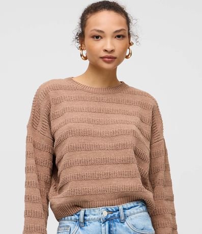 Ref: Blusa feminina em tricô leve, com textura em listras horizontais formadas por pontos vazados. Possui gola redonda, mangas longas e acabamentos canelados na barra e nos punhos.