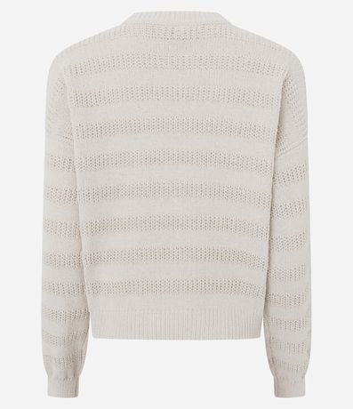 Blusa feminina em tricô leve, com textura em listras horizontais formadas por pontos vazados. Possui gola redonda, mangas longas e acabamentos canelados na barra e nos punhos.