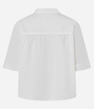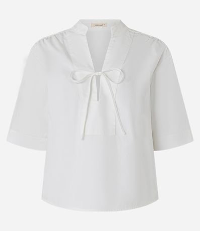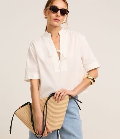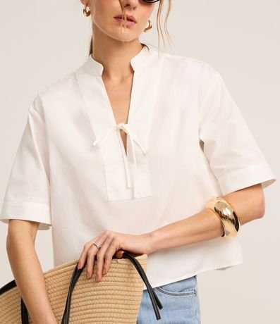 Ref: Blusa de mangas curtas, confeccionada em tricoline, com gola padre com pala, recorte V e amarração. Este produto possui algodão certificado BCI em sua composição, sendo ambientalmente mais responsável.