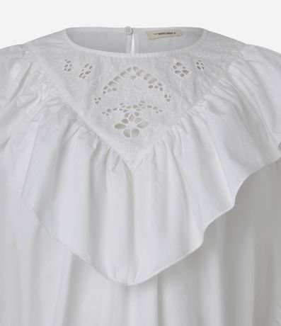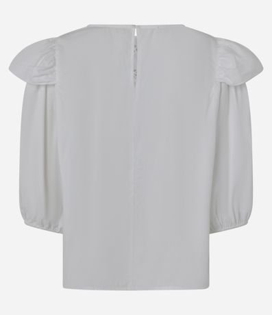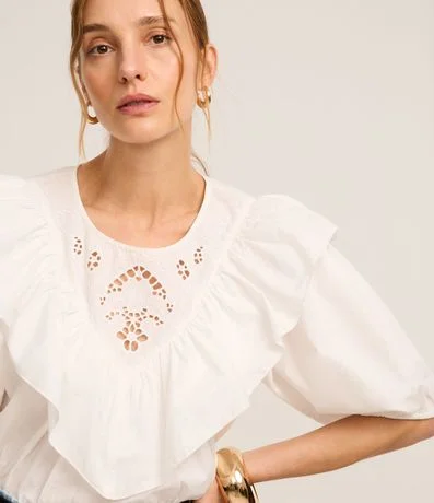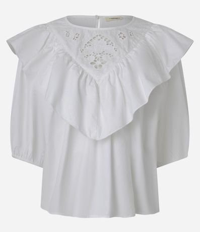 Ref: Blusa feminina delicada, confeccionada em tricoline, com gola redonda e mangas curtas bufantes. Sem estampa, possui detalhe em laise no peito, babado no busto e abertura em gota nas costas.