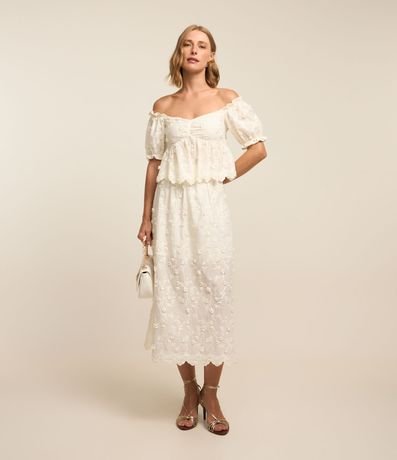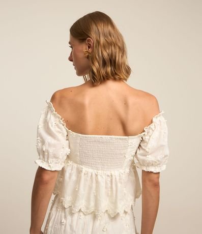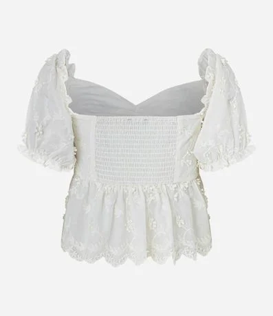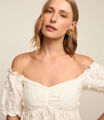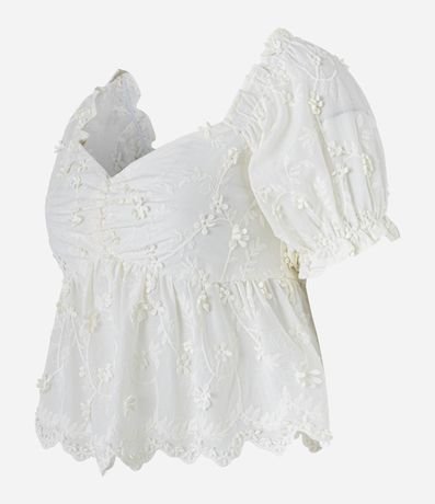 Ref: Blusa de mangas curtas com babadinhos com decote coração com franzido no busto e recorte franzido logo abaixo do busto. Possui florezinhas aplicadas. Estampada em tricoline.