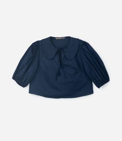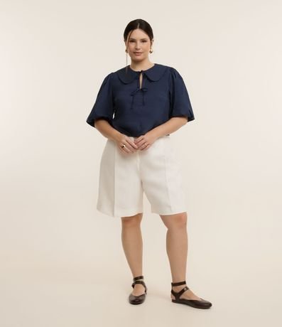 Ref: Blusa plus size confeccionada com algodão mais sustentável, sem estampa. A blusa tem mangas curtas bufantes, gola boneca e lacinhos frontais.