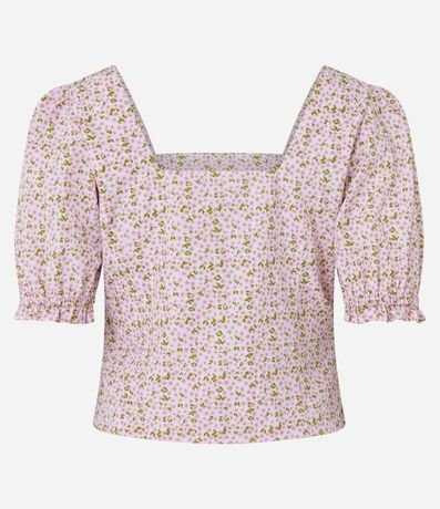Blusa feminina, confeccionada em tricoline, com decote quadrado, mangas curtas bufantes e estampa floral.