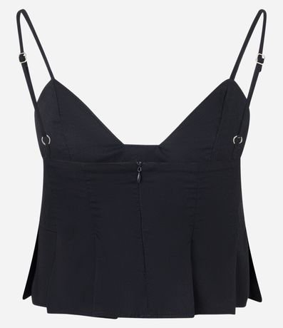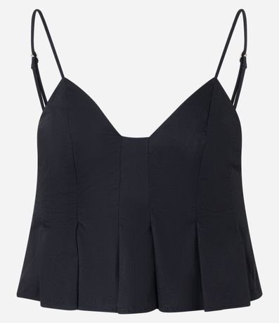 Blusa feminina, confeccionada em tricoline, com alças reguláveis, decote V, zíper nas costas e pregas na barra.
