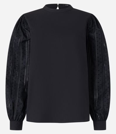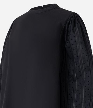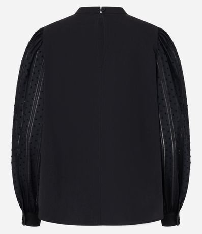 Ref: Blusa manga longa, confeccionada em tricoline com algodão bci mais sustentável, textura poá nas mangas, botões nos punhos e produzida em boas práticas ambientais.