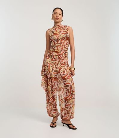 Ref: Blusa sem mangas, confeccionada em tule, com golinha alta, amarração na cintura e estampa abstrata.