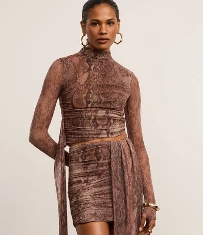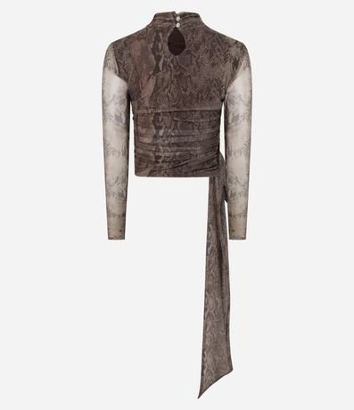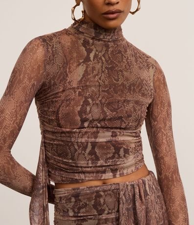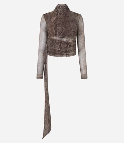 Ref: Blusa feminina em tule com golinha alta, manga longa com transparência. Peça estampada animal print de cobra com pontas longas em caimento.