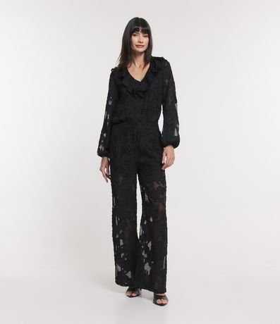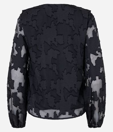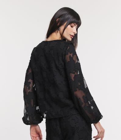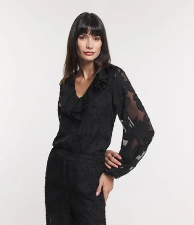 Blusa em tule, com babados jabô no decote, mangas longas e texturas.