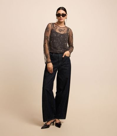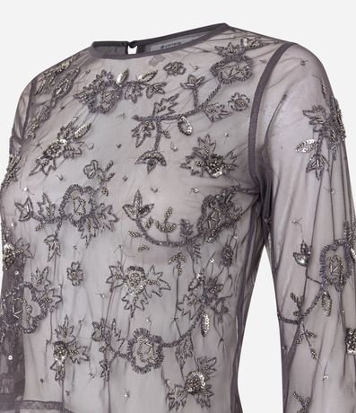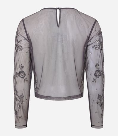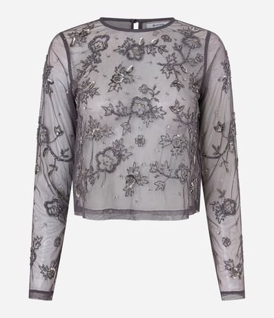 Ref: Blusa manga longa em tule com transparência, bordado floral e fechamento gota nas costas.