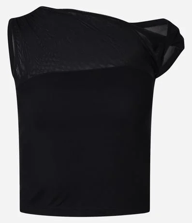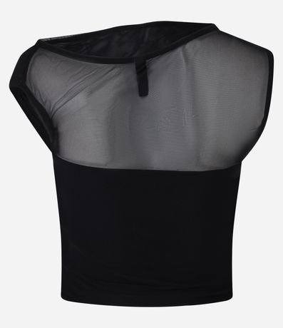 Blusa curta com decote ombro, confeccionado em tule e com detalhe torcido no ombro.