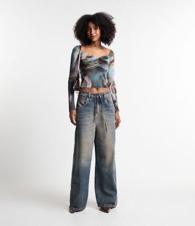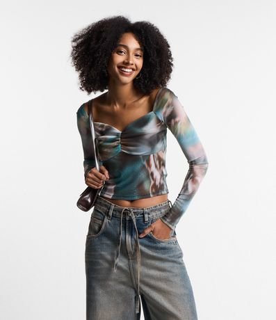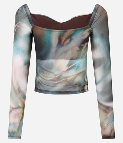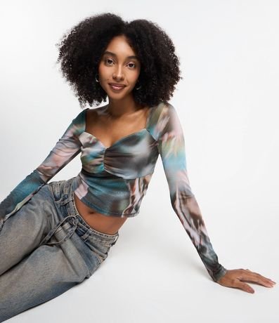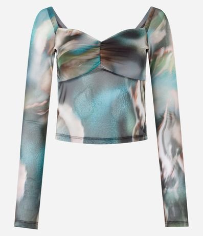 Blusa manga longa, curta, decote coração com franzidinho no busto e estampa abstrata manchadinha.