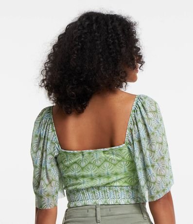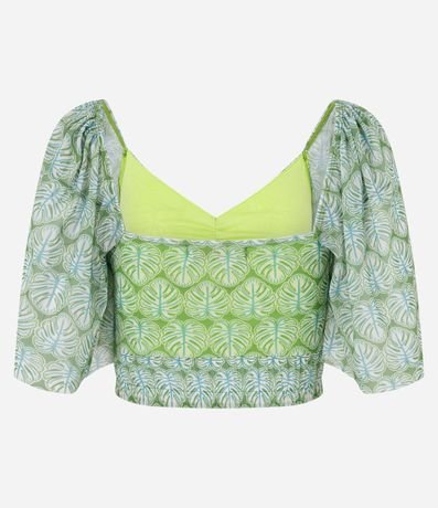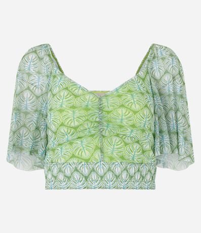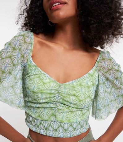 Blusa curta, em tule, com manga curta soltinha e estampa de folhagens.