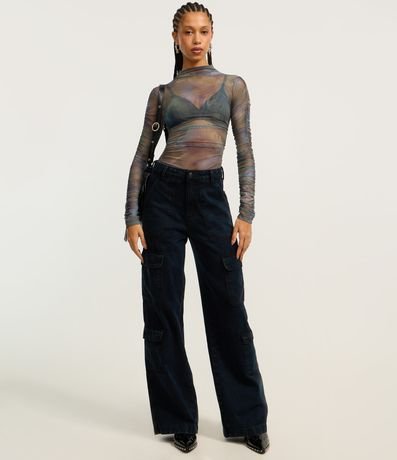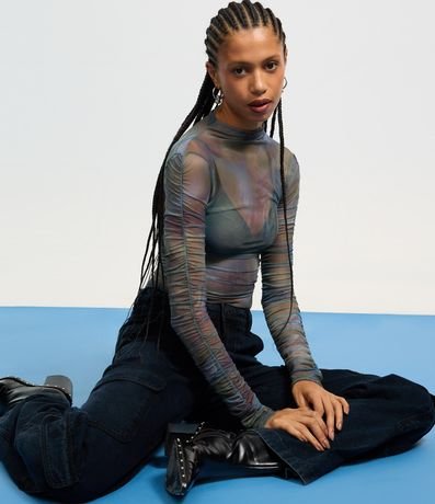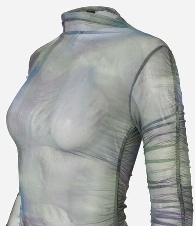 Blusa manga longa, confeccionada em tule com transparência, estampa efeito manchadinha e franzido na lateral.