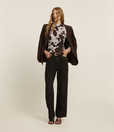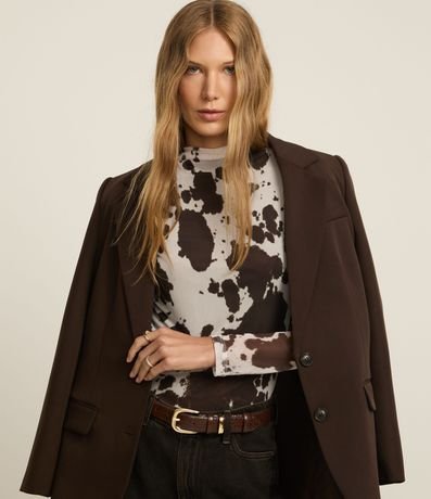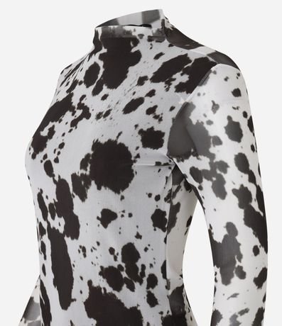 Ref: Blusa de mangas longas, confeccionada em tule, com golinha alta e estampa de animal print de vaca. Este produto foi fabricado através de processos mais sustentáveis, adotando boas práticas ambientais.