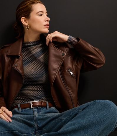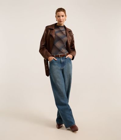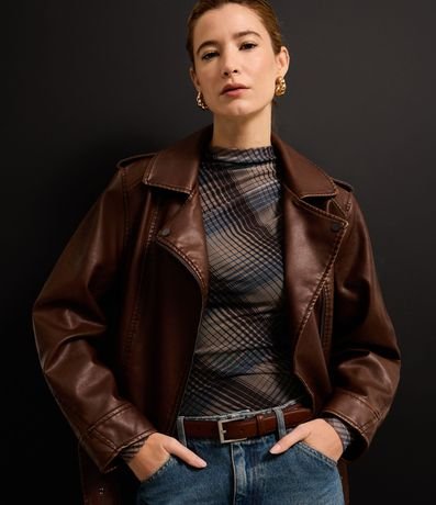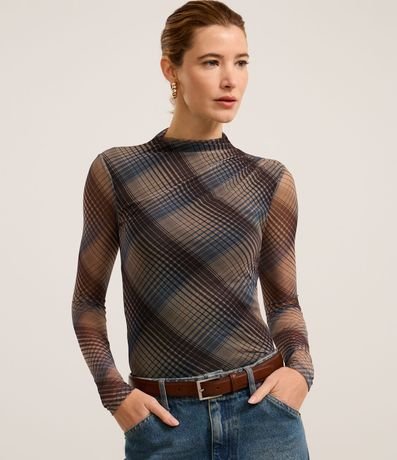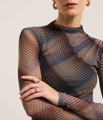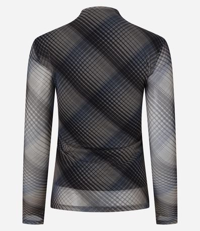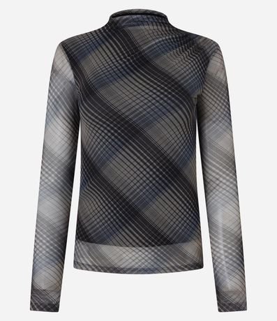 Ref: Blusa de mangas longas, confeccionada em tule, com golinha alta e estampa xadrez em linhas com larguras e cores alternadas que criam um efeito degradê. Este produto foi fabricado através de processos mais sustentáveis, adotando boas práticas ambientais.