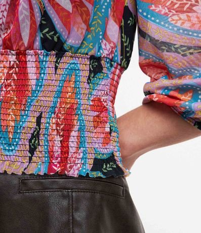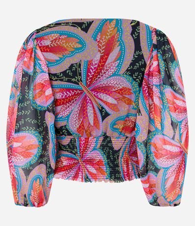 Blusa feminina confeccionada em tule, com decote V, mangas longas bufantes e barra em lastex. Possui estampa de borboletas e folhagens.