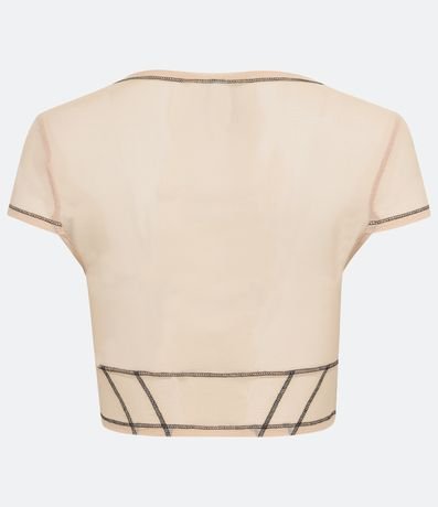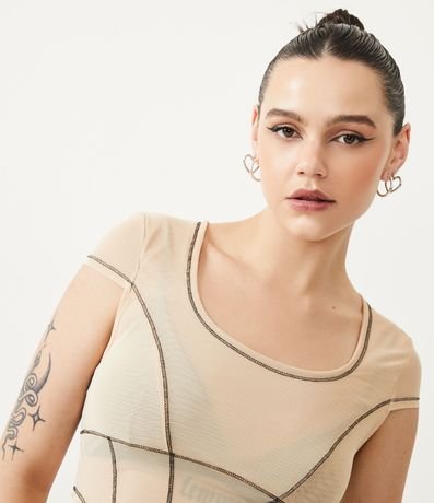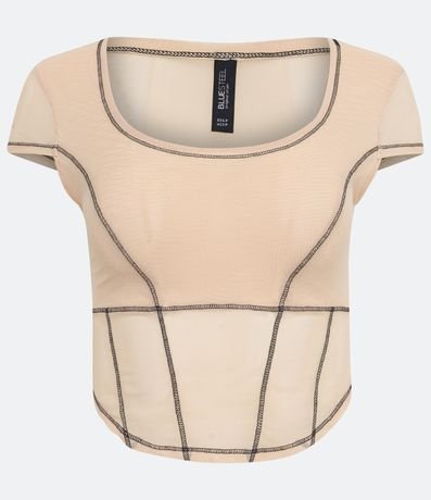 Blusa em Tule com Manga Curta e Pespontos Contrastantes