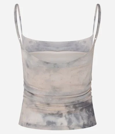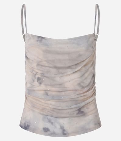 Ref: Blusa feminina confeccionada em tule, com alcinhas finas fixas e decote reto. Possui padronagem abstrata de efeito manchado, com strass hot fix aplicados e drapeados nas laterais.